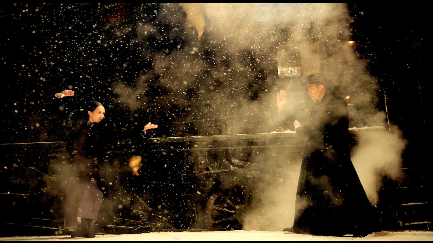 Estomper la démarcation entre concret et irréel pour former une autre réalité, c’est la volonté du cinéma de Wong Kar-Wai. S’il s’attaque (étonnement) au film de Kung-Fu, il le fait pour accoucher d’une nouvelle vision : un renouveau qui tend autant d’un retour au réalisme que d’une façon nouvelle d’amener la dimension chimérique et onirique qui fait le succès du genre. The Grandmaster se veut être le pionner du « vrai » kung-fu comme le montre son sous-titre : « il était une fois le Kung-Fu ». Wong Kar-Wai s’entoure du Maître Woo-Ping Yuen pour livrer une œuvre sans artifice. Finit les fantaisies visuelles avec des individus combattants dans les airs ou courant sur les murs. Jamais le sang ne jaillit. Un adversaire ne meurt pas, il disparaît derrière les panneaux de bois détruits. L’œuvre de Wong Kar-Wai marque ainsi un retour à la beauté même du combat sans la glorifier et sans lui rendre un côté trash : seule la beauté du geste compte. Cependant, Wong Kar-Wai reste un cinéaste de l’esthétique. Cette réalité lui permet alors de décaler l’intérêt des gestes des combattants à leur répercussion sur l’environnement. The Grandmaster est une œuvre minérale : ce n’est plus le coup porté qui est le centre de l’image, mais la poussière qui se soulève, la neige qui glisse, le bois qui se fissure. On glisse alors en quelque sorte d’un microcosme à un macrocosme. Et c’est dans ce décalage que la beauté visuel de Wong Kar-Wai fait des miracles. C’est d’ailleurs l’extérieur qui se charge des fantaisies : un train qui passe sans fin lors du combat entre Gong Er (Zhang Ziyi) et Ma san (Jin Zhang), un jardin enneigé peuplé de cerisiers en fleur.